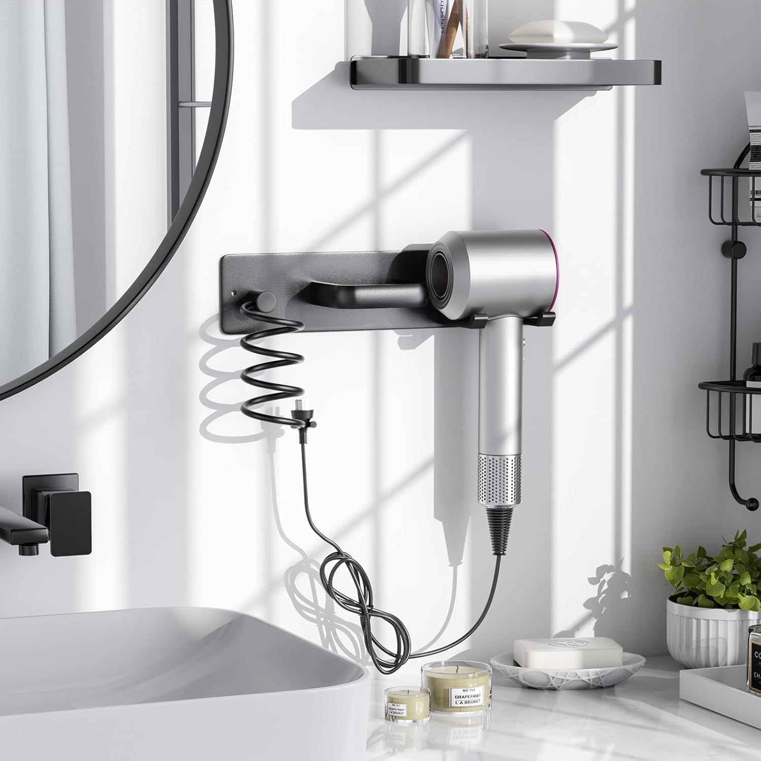 Organiza tu zona de peinado con elegancia y funcionalidad gracias al soporte mural 3 en 1 Tindbea, diseñado para ofrecer almacenamiento seguro y eficiente para tu secador, rizador y accesorios. Fabricado en metal mate de alta calidad, combina resistencia, diseño y practicidad en un solo producto.